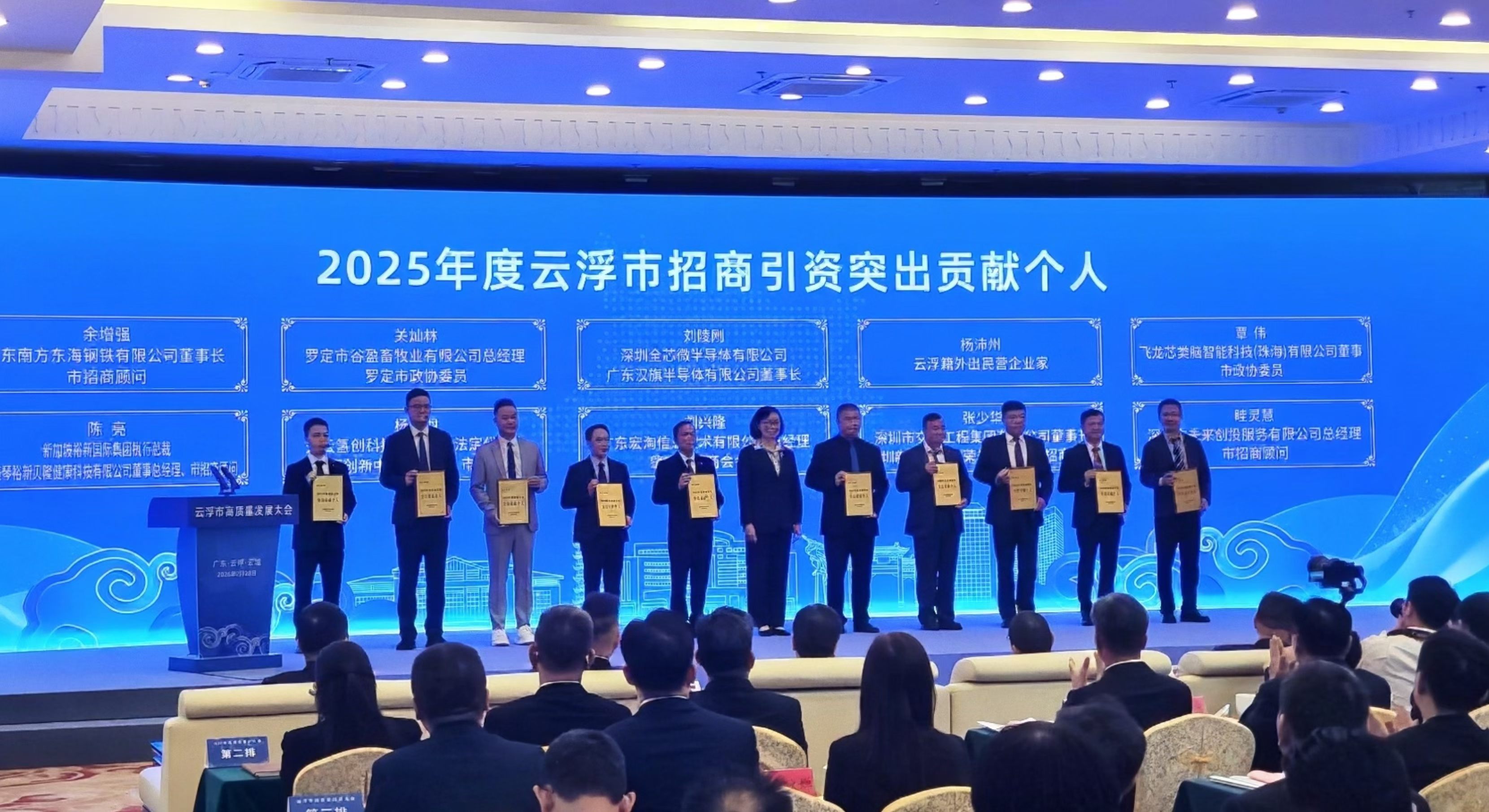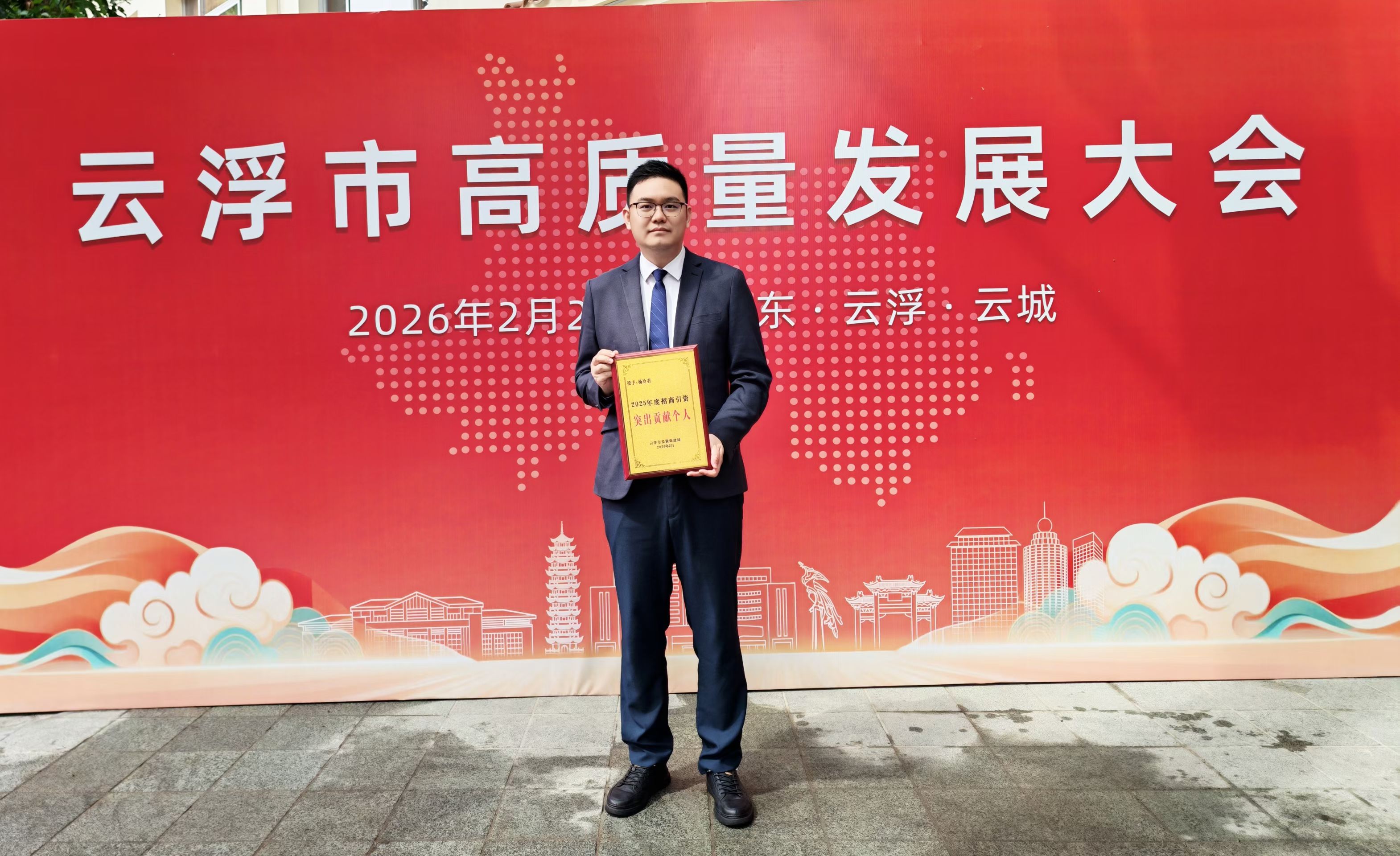 2026年2月28日,云浮市委、市政府隆重召开云浮市高质量发展大会,大会期间对在全市招商引资、项目建设、产业发展等工作中作出卓越贡献的先进个人和集体进行隆重表彰。国际氢能投资协会执行会长总杨冷羽凭借在推动地方产业升级、助力招商引资落地、服务区域经济发展中的突出成绩与责任担当,被授予2025年度招商引资“突出贡献个人”荣誉称号,并现场接受表彰。