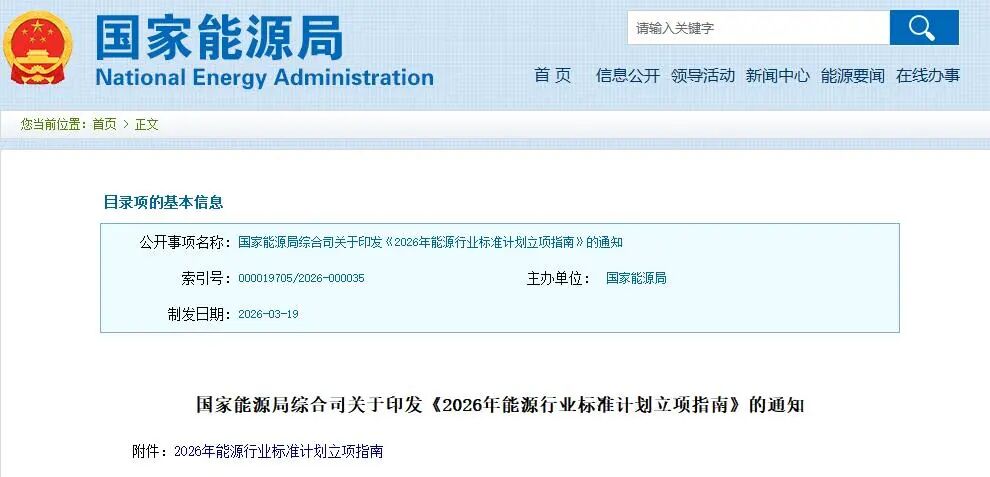 国家能源局印发2026年能源行业标准立项指南,支持新业态标准化与多元主体参与,涵盖八大重点领域,明确氢能、绿色燃料等细分方向。